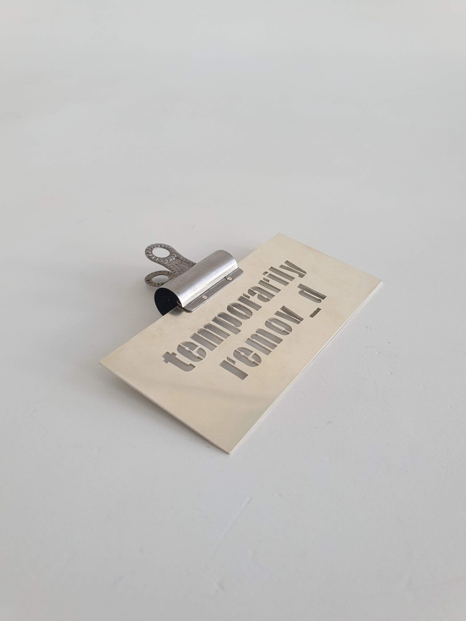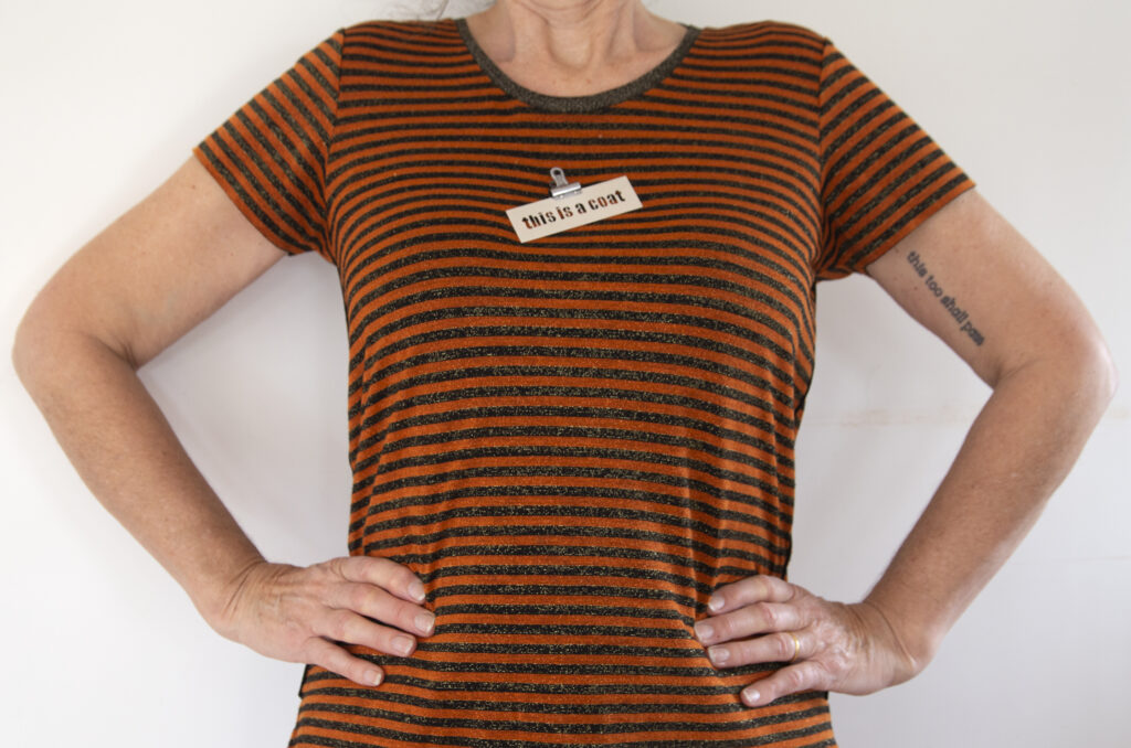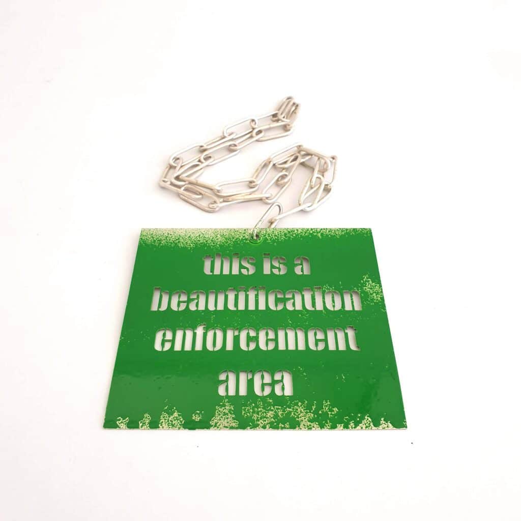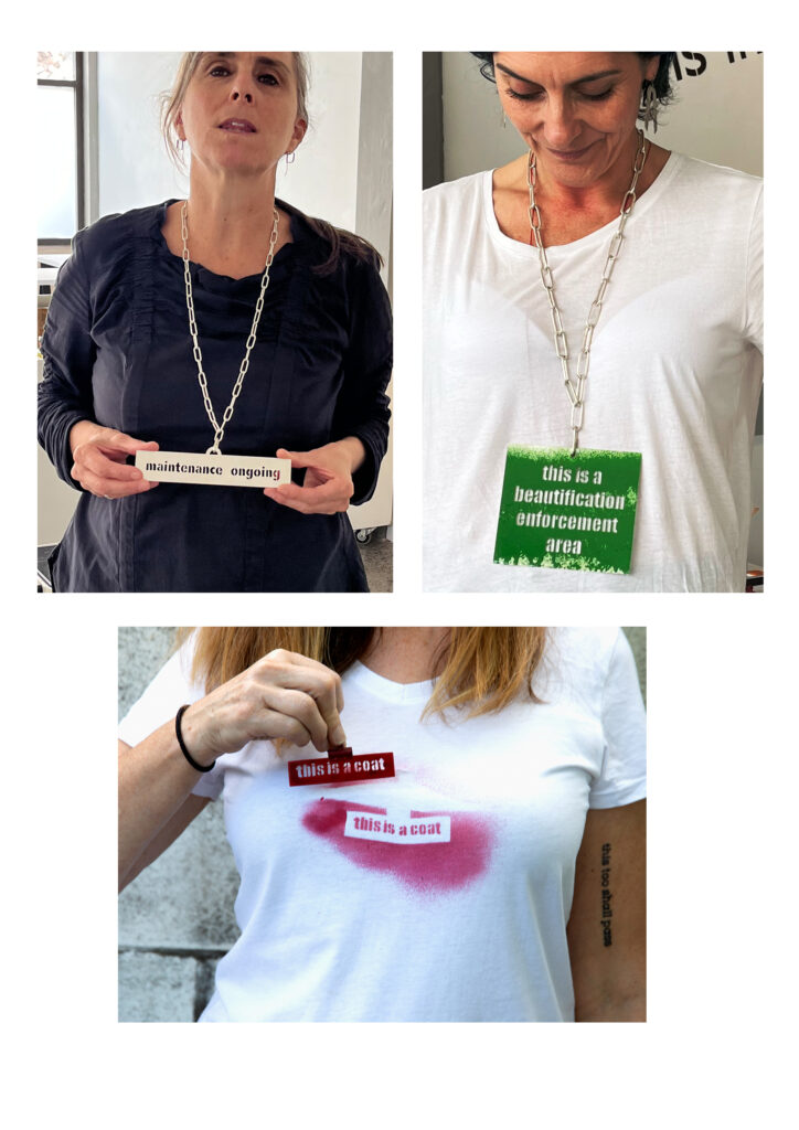 Meaning shifts when words are placed on the body. As an article of adornment, Beautification Enforcement Area could relate to the subject of aging, or the use of filters on social media apps to modify our appearance, or more dramatically, the proliferation of cosmetic surgery and other interventions to attain unrealistic, age defying ideals of beauty and perfection. A recent article in The Guardian noted that shockingly ‘a third of girls say they won’t post selfies without enhancement.’ Meaning shifts again when the form of the jewellery object is a painstakingly hand pierced silver stencil. Enabling the wearer to stencil words onto other places, other people, other objects, enabling the wearer to publically not just voice an objection, an observation, an idea but to physically implement one. And, how much of what we read can we believe? Is this really a coat?