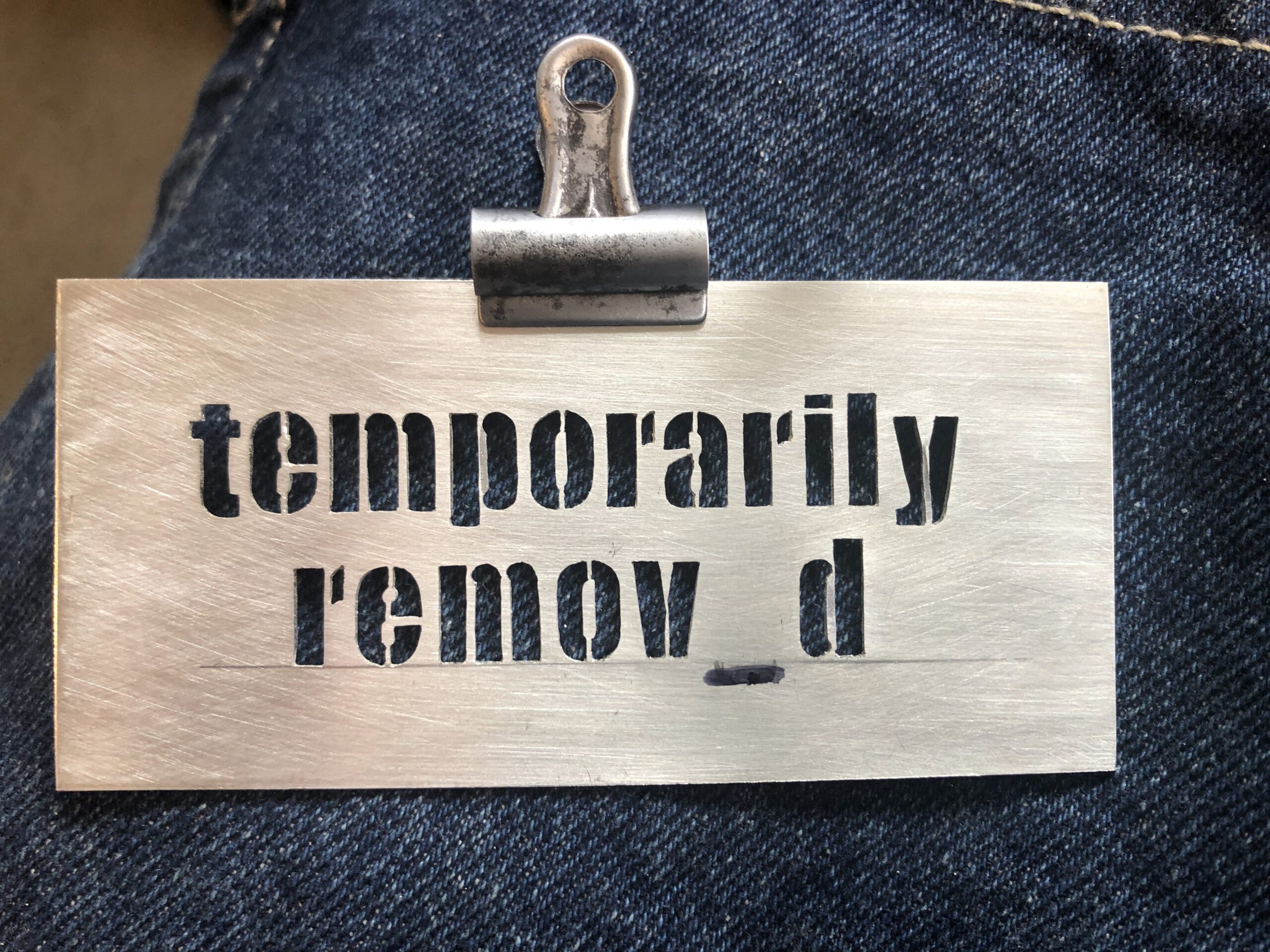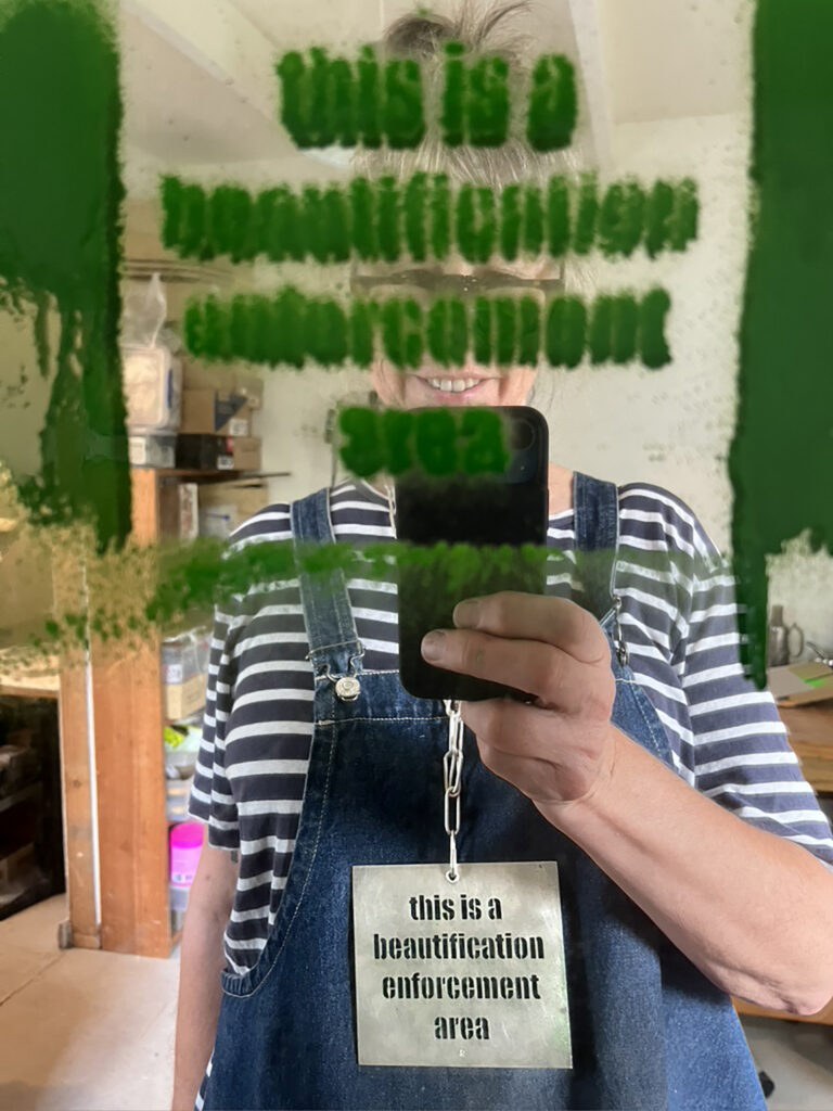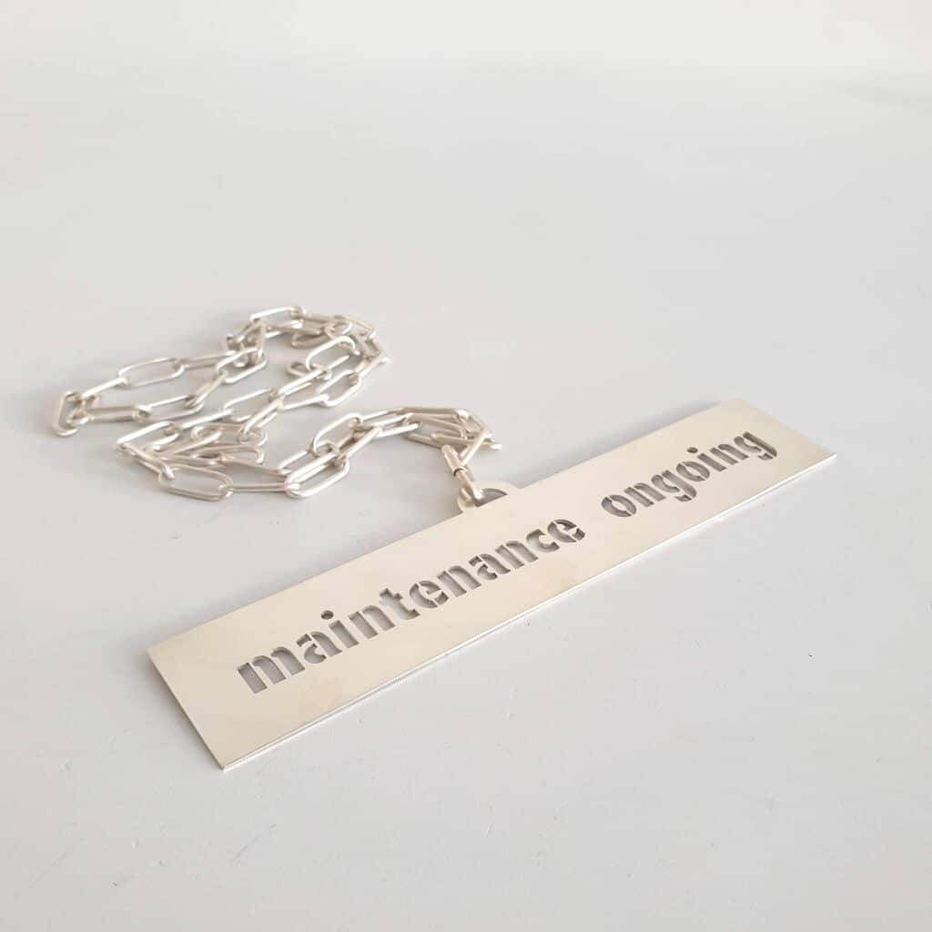 Meaning shifts when words are placed on the body. As an article of adornment, Beautification Enforcement Area could relate to the subject of aging, or the use of filters on social media apps to modify our appearance, or more dramatically, the proliferation of cosmetic surgery and other interventions to attain unrealistic, age defying ideals of beauty and perfection. A recent article in The Guardian noted that shockingly ‘a third of girls say they won’t post selfies without enhancement.’ Meaning shifts again when the form of the jewellery object is a painstakingly hand pierced silver stencil. Enabling the wearer to stencil words onto other places, other people, other objects, enabling the wearer to publically not just voice an objection, an observation, an idea but to physically implement one. And, how much of what we read can we believe? Is this really a coat?